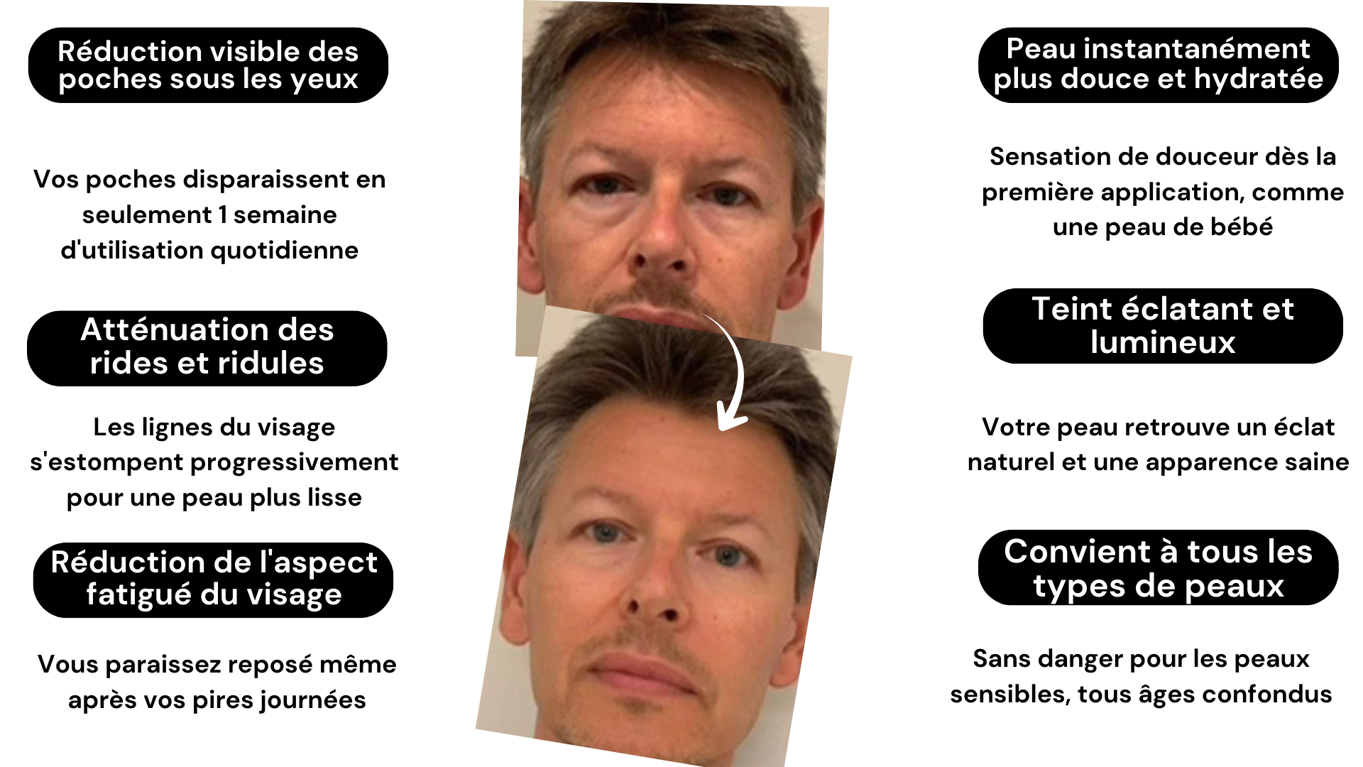 Résultats cliniques : réduction de 67% des rides et 80% des poches en 7 jours. Un produit à l'efficacité démontrée et 100% naturel.